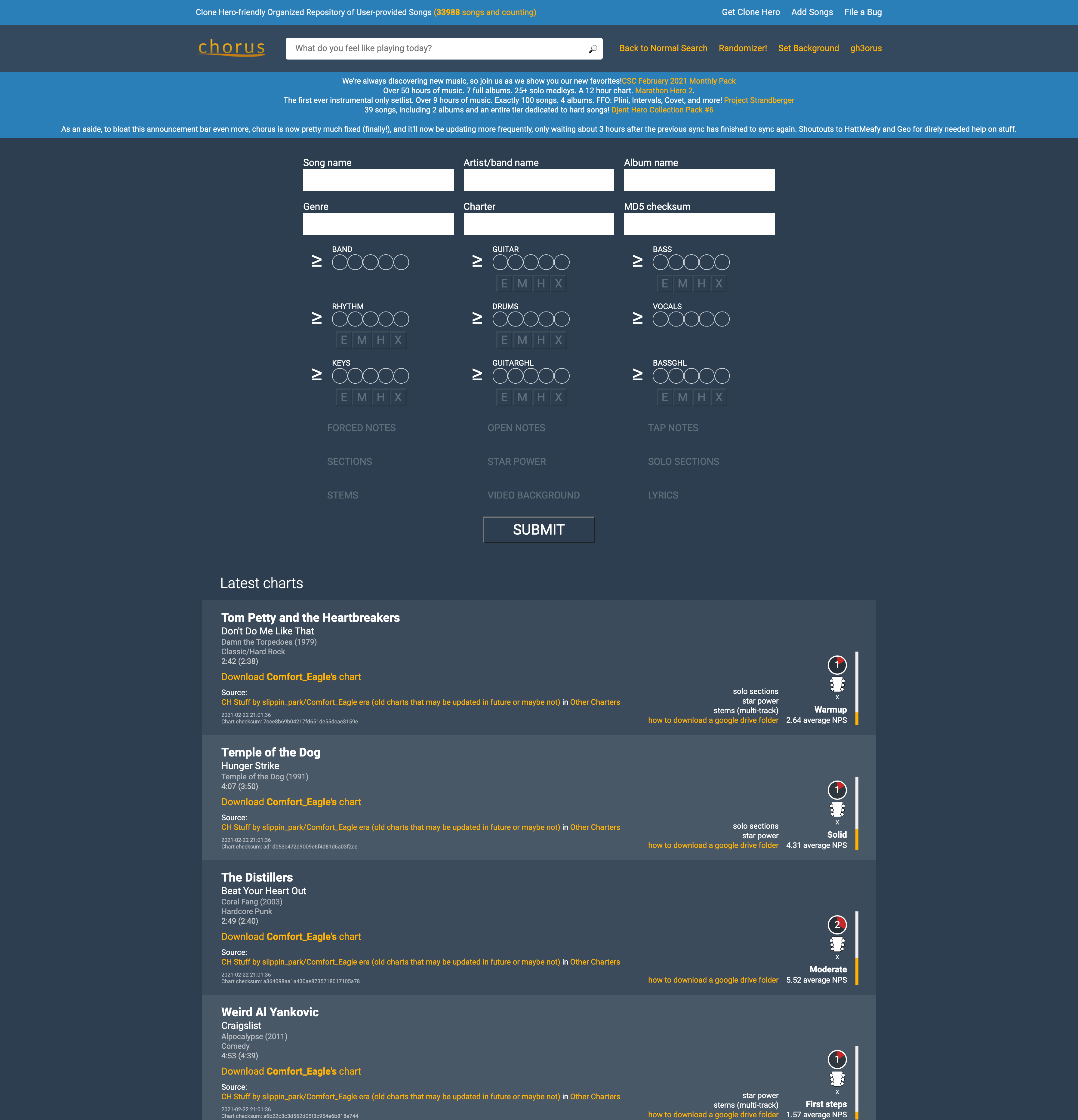 A site unfamiliar to most, yet important to me, is the site that I used to download much of the necessary content to play the game Clone Hero, which is essentially a computer version of Guitar Hero that gives you access to all existing songs from the Guitar Hero games and various community made songs. The site as it stood worked decently to find some individual songs, but I felt that the layout could be improved to allow for easier filtration and analysis of the songs before somebody goes to download a song. You can really only find songs that you know specific details about, like the song name and the artist, or details about the chart of the song, such as the difficulty and the playable instruments.